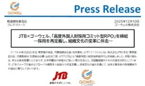 将来のグローバル戦略を見据え、優秀な外国人材の採用を強化するJTBに対し、弊社が「高度外国人財採用コミット型RPO」プランを通じて、外国籍人材の採用アドバイザリーから母集団形成、人選まで一貫して伴走支援してまいります。